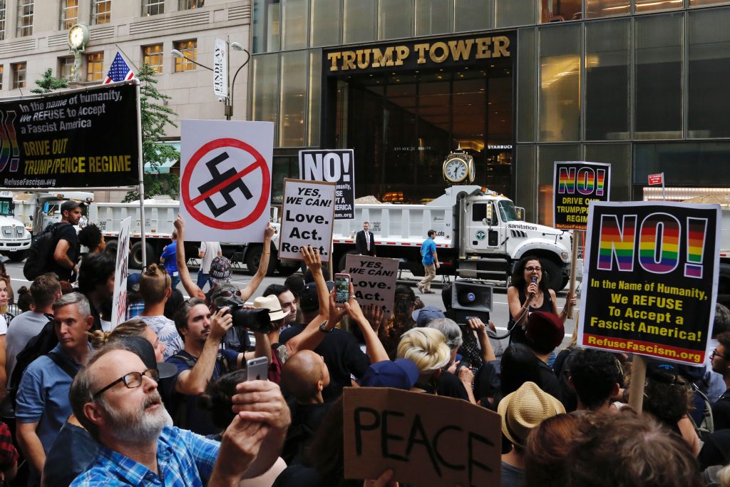 Protesters gather near Trump Tower against US President Donald Trump August 14, 2017 in New York.
